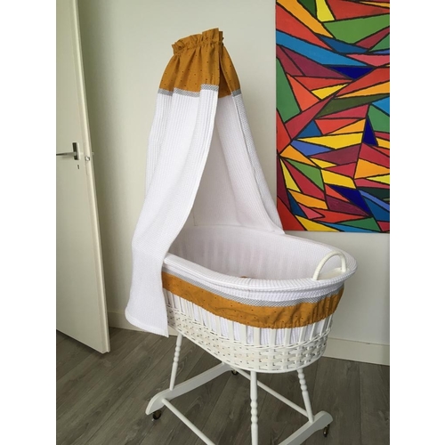 Wieg waar ik ook in heb gelegen. Opnieuw bekleed met wafelstof en gele accenten. Heeeel erg blij mee.