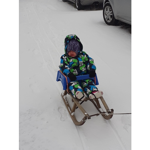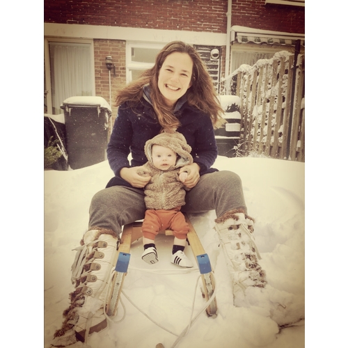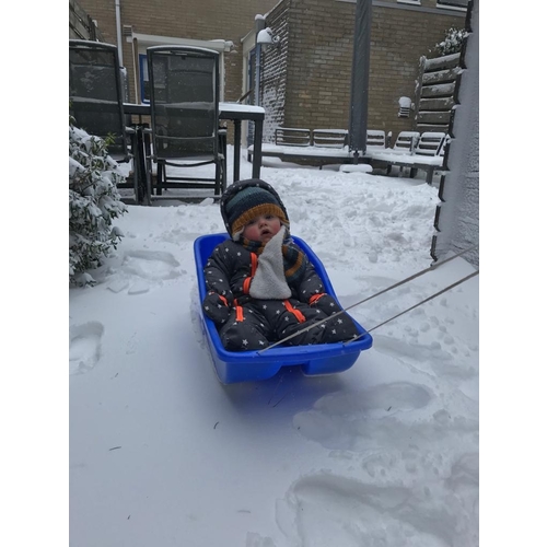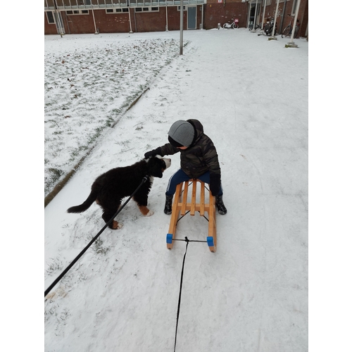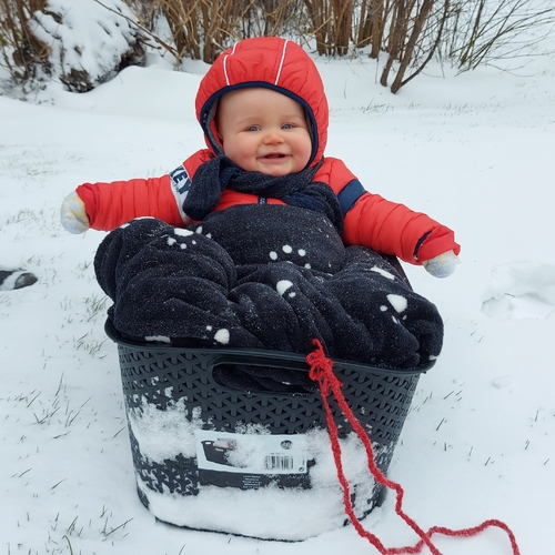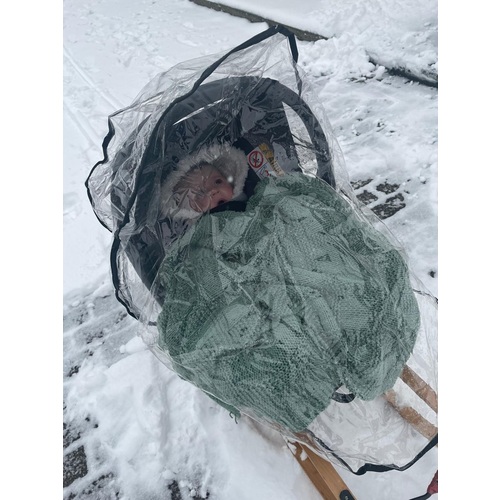 Hier de maxi cosi op de slee gebonden, lekker dik ingepakt, hij had het in ieder geval een stuk warmer dan wij😂 Hij was ook verbaasd dat er sneeuw lag 😂