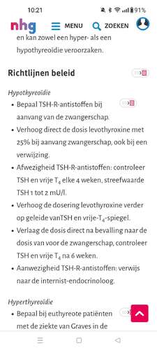 Ik zou het inderdaad nog eens met de huisarts bespreken. Je kan hem wijzen op de NHG richtlijnen van huisartsen (zie screenshot). Ik had aan het einde van de zwangerschap ook een TSH ronde de 3 en moest direct in medicatie verhogen. En een tip die ik je nog kan meegeven: luister goed naar je lichaam. Zet een stapje terug als je lichaam het aangeeft. Ik zou het vooral met je werkgever (indien je die hebt) bespreken; zo heb je recht op bijvoorbeeld extra pauze (https://www.juridischloket.nl/werk-en-inkomen/ziekte-en-zwangerschap/rechten-werk/). Je kan ook altijd een (preventief) gesprek met de arboarts aanvragen. Het belangrijkste is nu de gezondheid van jou en de kleine, werken kan altijd nog. Sterkte en ik hoop dat je snel weer kan genieten van je zwangerschap!