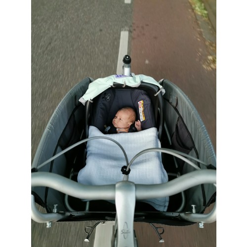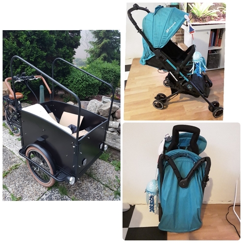 Ik heb een bakfiets gekocht en daar bij een kleine buggy (5.6 kilo) die makkelijk in te klappen is en dook lekker klein zodat hij in de bakfiets past.