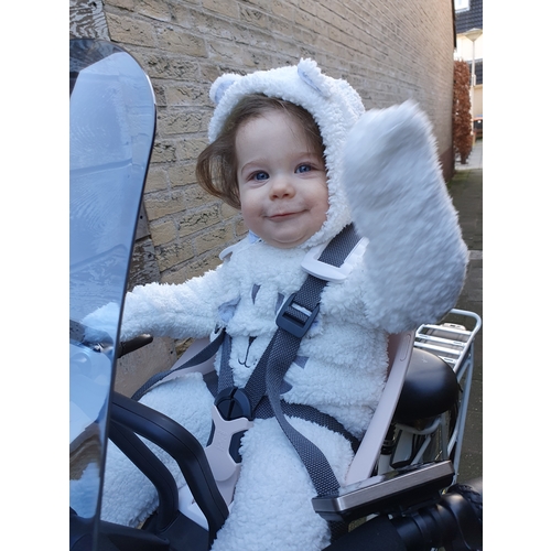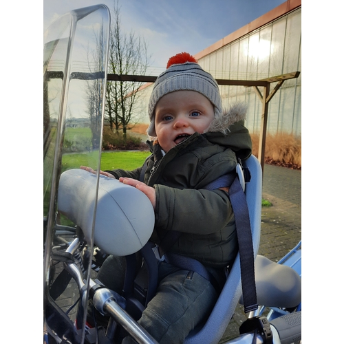Elektrische fiets met een voorzitje bobike, gaat heel prima en hij vind het ook leuk!