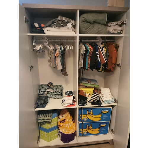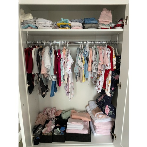 Wij doen alles wat te klein is direct in dozen en hebben 'n kast met hanggedeelte en 2 planken. De linkerkant vd kast is huidige maatje en rechterkant vd kast is toekomstige maatjes. Bovenste planken ligt beddengoed, boxkleed etc.