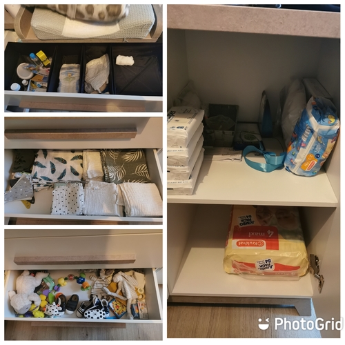 In de bovenste lade van de commode liggen de rompertjes en sokjes van de huidige maat, luiers. Daaronder 'n lade met alle hydrofyle doeken, groot/klein, washandjes, monddoekjes etc. En onderin 'n lade met speelgoed en schoentjes.