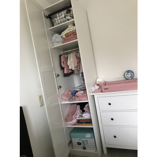 Ik heb tot nu toe alle kleertjes die passen nog in de commode, alles wat niet meer past ligt op een grote hoop in de te kleine wieg 😅. De kast is nu nog ingenomen door beddengoed (niet gevouwen, maar ook op een hoop) en maxi cosi. Een zooitje dus. En ik maar tegen mezelf zeggen dat ik de kast ga indelen zodra ik tijd heb ... Inspiratie en tips zijn hier ook welkom.