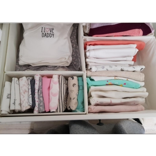 Ik heb de grote commode kast van de Ikea; daar past alles perfect in. Ik had eerst een lade maat 50, maat 56, maat 62 en maat 68. Ondertussen maat 50/56 geruimd; in curverbakken op de zolder. Nu maat 62 over 2 lades verdeeld, een lade maat 68 en een lade voor grotere kleertjes.