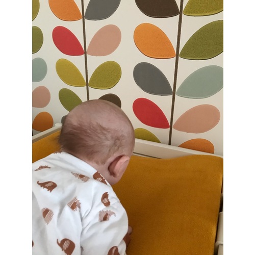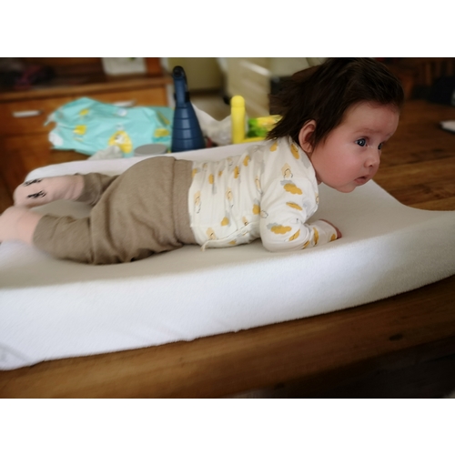 Wij hebben een week of twee geleden ontdekt dat onze zoon grote fan is van ons behang nadat hij tijdens het verschonen kirrend omhoog begon te kijken naar de bloemblaadjes. We leggen hem nu dus op zijn buik met zijn gezicht richting behang. Zo heeft hij wél zin om zijn hoofdje omhoog te doen. Ervoor deed hij het bijna alleen als hij op onze buik lag. Plat op het verschoonkussen of op een deken vond hij toen maar niks.
