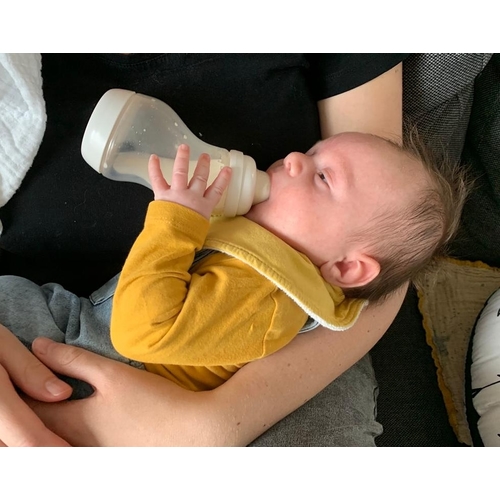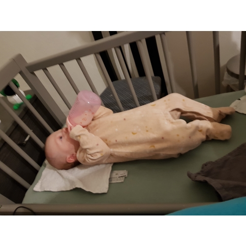 Onze zoon pakte hem voor het eerst stevig vast met beide handen toen hij nog niet eens vier weken was... Mijn lief liet voor de grap even los, en die kleine bleef die fles gewoon vasthouden en verder drinken. Eerder per ongeluk dan bewust toen, maar vanaf 6 weken begon hij dat echt gericht te doen en trok hij de fles naar zijn mond. Nu kunnen we ook met gemak loslaten. Hij trekt zijn plan. 🤷🏻‍♀️