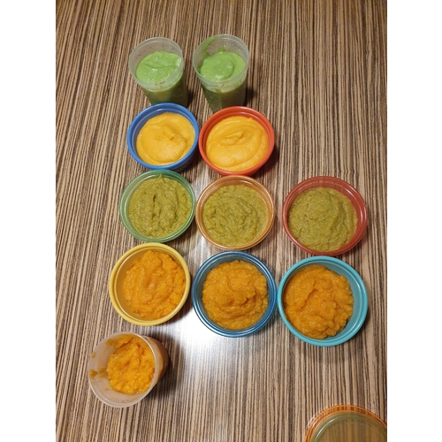 Ik heb bakjes van Nuby, gaan tot 250ml volgens mij. Eens in de week maak ik de bakjes met aardappelen, vlees en groente en vries ik dan in.