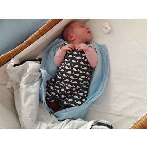 Wij hebben een inbakerslaapzak van woombie. Deze zijn van een rekbare en dun materiaal die nauw aansluiten om de geborgenheid van de baarmoeder na te bootsen. Daarin is ze nog wel vrij om haar armen enigszins te bewegen. Onze oudste had ook graag haar handen bij haar hoofd en zo kon ze in ieder geval met haar handjes onder haar kin. Op de foto zie je in welke houding ze ligt in het slaapzakje.