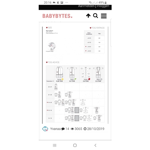 Wij gebruiken nu slaapzakken van Ergopouch (TOG 1) en Bemini (TOG 1,5). We hebben eentje van Hema klaarliggen (TOG 2,5). Met geen dikke pyjama kan hij die aan als het ietsje frisser is. Nu is het gemiddeld tussen de 20 en 22 graden op onze kamer ‘s nachts.
