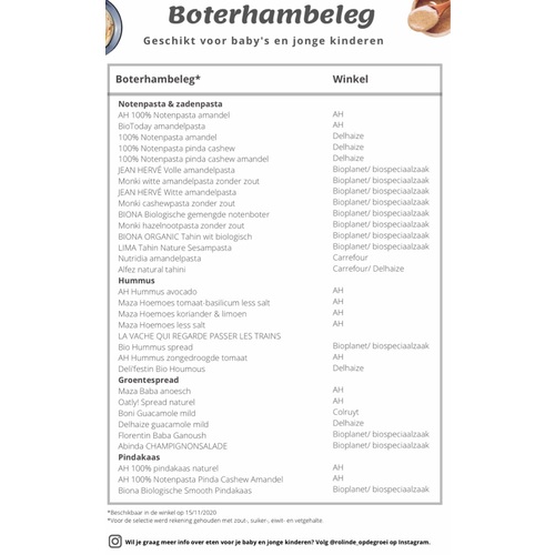 Hier een baby met koemelkallergie dus een boter op basis van soya. Verder pindakaas naturel 100%