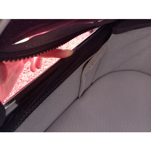 Uit mijn hoofd moet dat klittenband naar buiten gevouwen worden zodat je de buitenkant van de kap er op kan plakken.
