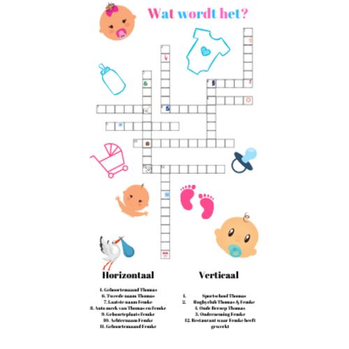 Ben niet heel erg van een feestje geven om het geslacht bekend te maken, maar om nou te appen vanne: het is een jongen! vond ik ook gek. Ik heb een kruiswoordpuzzel gemaakt met vragen over mij en mijn vriend en onze familie/vrienden konden zo zelf erachter komen wat het wordt. Iedereen vond het super leuk!