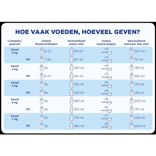Rond half 1 s nachts, tussen 5 en 6, tussen 8 en 9, tussen 11 en 12, rond 16, rond 19u. Maar soms komt hij dus eerder s nachts, dan geven we een kleine fles en dan komt hij vaak rond half 7 s ochtends weer. Overdag zit er meestal 3,5 uur tussen de voedingen en we komen eigenlijk altijd uit op 6 flessen.