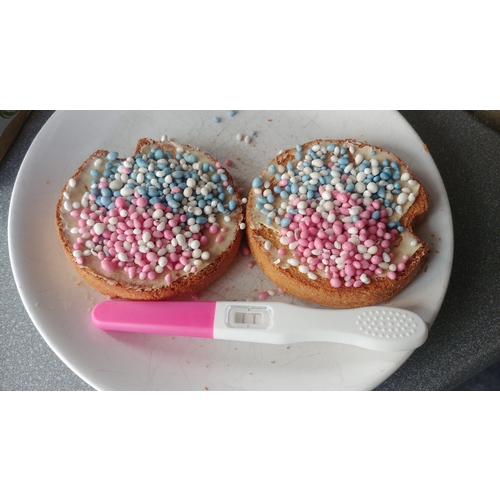 We zouden wachten tot de 1e echo a.s maandag maar k kon niet omgaan met zo'n groot geheim. Dus toch maar besloten om het te vertellen dmv een kadootje, in een kadootje en daar zat de positieve test ingewikkeld in keukenrol. Een totaal onverwachte blijdschap bij beide ouders en broers en zusje.