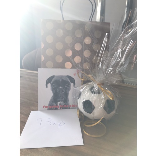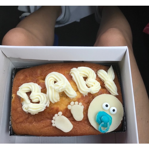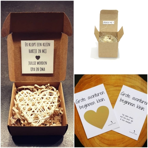 Gebaks doos vol met beschuit en muisjes, en op de binnenaknt van de doos een foto. En nog een rompertje met de tekst als het van mama en papa niet mag vragen ik het wel aan opa en oma. Maandag ben ik 5 weken en aangezien ik elke dag met mijn ouders werk in de zaak en ik nu al goed misselijk ben en moe en rugpijn is het wel fijn dat ze weten waarom haha
