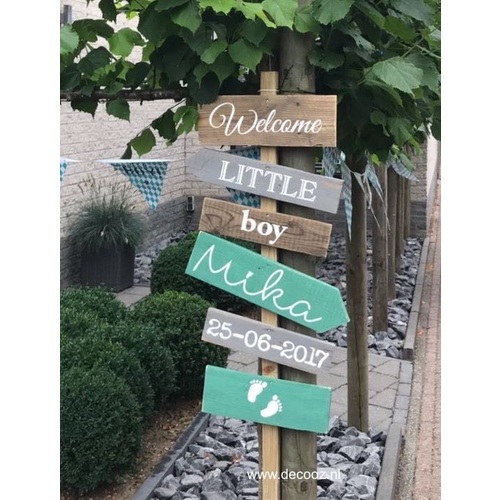 We hebben ons eigen bord gemaakt. De namen die we hebben bedacht (we weten niet wat het wordt) zijn ook uitgezaagd letter voor letter gefiguurzaagd en ligt allemaal klaar voor als de kleine geboren wordt. verder slingers buiten van boven naar geboorte bord en binnen niks alleen kaartjes die we misschien krijgen en de cadeaus