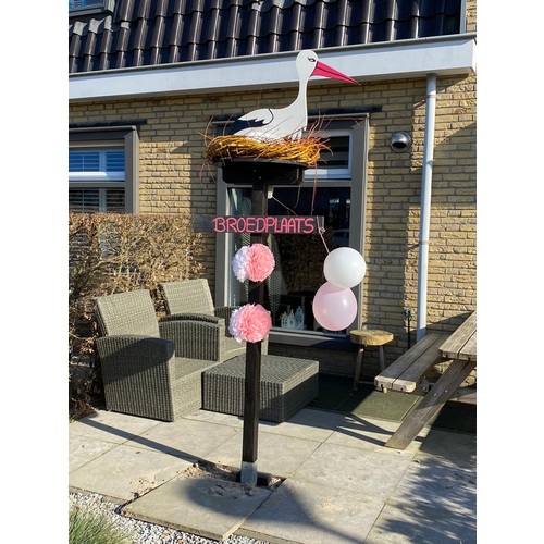 Ik heb hele creatieve schoonouders 💖🤩. Die hebben deze gemaakt. En als de kleine meid geboren is veranderd de ooievaar van een zittende broeiende ooievaar in een staande ooievaar met een roze strik en wordt het bordje broedplaats vervangen door een zelfgemaakt houten bord in de vorm van een hartje met dr naam erop 💖🤩