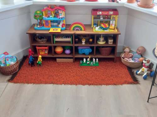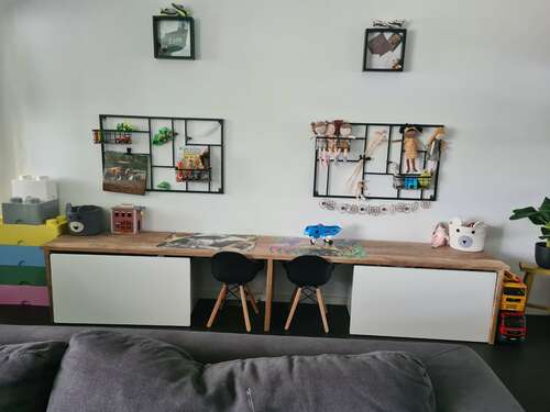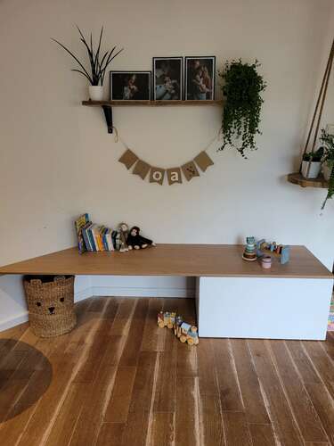 Ja het is gewoon een plank met aan de zijkanten ook een stuk plank geschroefd... de speelgoedlade is van ikea en de rekken aan de muur van de xenos. Broer is 2.5 dus die maakt er iets meer gebruik van, die gaat er ook met zijn duplo aan spelen enzo.. ons meisje van april doet er wel aan kleuren maar speelt er vooral nog omheen.