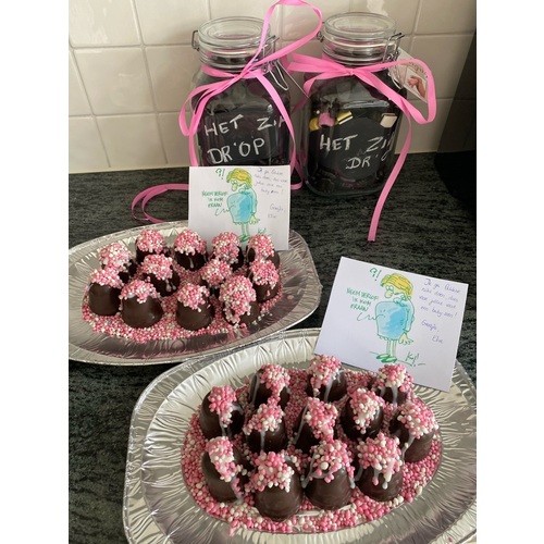 Ik had een roze kwarktaart gemaakt met roze muisjes erover. Viel goed in de smaak. Wil je echt coronaproof gaan dan zag ik een leuke: een glazen pot met allemaal verpakte kitkats erin. Kaartje erbij "I have a break, you have a kitkat". En lekker simpel ook nog :)