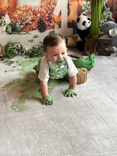 Wij hadden vandaag ook een cake smash en hij vond de taart helemaal niks haha. Hij vond t echt niet lekker. Maar we hebben m ingesmeerd en zn handjes in de taart geduwd dus voor de foto’s lijkt t wel alsof hij het lekker vond haha. Hij vond t in het begin wel spannend maar gelukkig met Juf Roos muziek en veel zingen ging hij lachen 😆