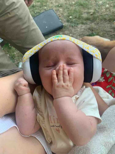 Onze dochter is al meerdere keren mee gegaan naar een gehorig evenement met bescherming op, en slaapt meestal overal doorheen. Gisteren moest haar papa optreden en was ze wel onrustiger, maar ik denk dat dat ook kwam doordat jan en alleman boven de kinderwagen hing.