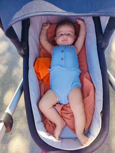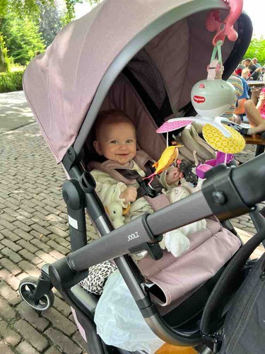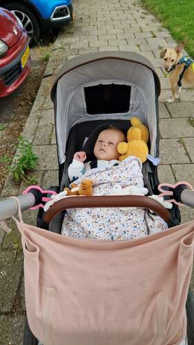 Ik had de verkleiner van de maxicosi in haar nek gelegd zonder het stuk schuim zeg maar. Hier was ze 11 weken volgens mij. Maar nu met 14 weken ook nog even in de bak die niet meer past 😆 ze wiebelde zo heen en weer in de buggy zit dat ik het eng vond