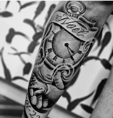 Ik heb zelf een hele grote, geboortedatum in romeinse cijfers en zijn naam ...