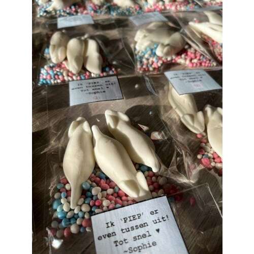 Chocolade au bain marie smelten met boter erdoor. Allerlei lekkers erdoor roeren (bijv. Malterzers, stukjes biscuitjes, noten, m en m, rozijnen) en natuurlijk muisjes. Op een bakplaat uitstorten met bakpapier, nog wat muisjes bovenop en uit laten harder. In kleine stukken hakken (best machtig) en smullen maar.