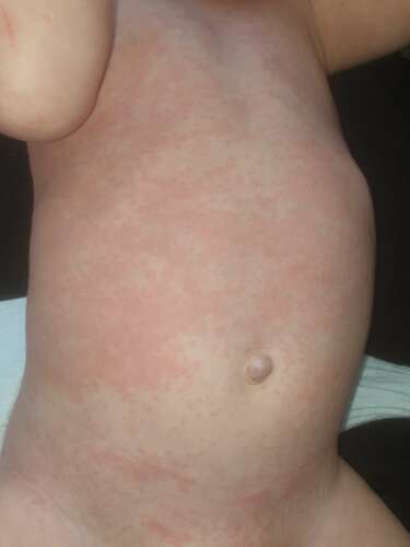 Ik zou direct actie ondernemen en naar de huisarts gaan. Ziet er ook een beetje uit als de ziekte van Kawasaki. Ik ben geen arts dus neem mijn suggesties niet te serieus.