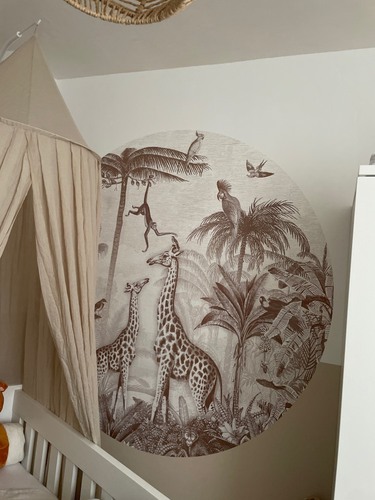 Hier gekozen voor het volledige behang in kleur bruin (misschien wat moeilijl te zien met de belichting). Wel een best prijzig behang. Nadien nog een andere print gekocht voor de kamer van ons oudere zoontje (met dezelde afmetingen) en het Pimpelmees behang was 3 keer zo duur...