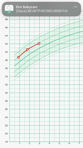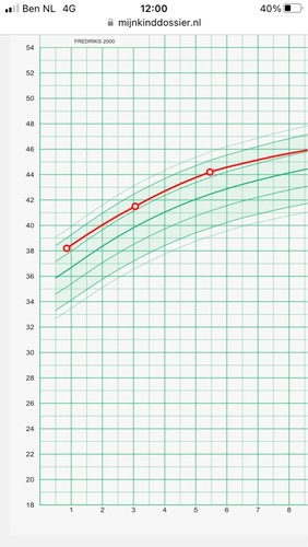 Geen zorgen maken. Zolang die beetje zijn eigen lijn volgt is het helemaal oke ! Mijn oudste had met 3 maanden 43,5 cm. Was ten opzichte van 2 maanden minder hard gegroeid, dus toen met 4 maanden extra controle maar volgde netjes zijn eigen lijn. Kunnen ook net groeispurt gehad hebben of iets.