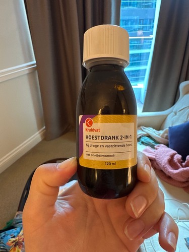 Ik heb t toen ik griep had nagevraagd aan de vk en die zei: nee, geen enkele hoestdrank. Honing, brandnetelthee, gember en vicks hebben me door de dagen en nachten geholpen!