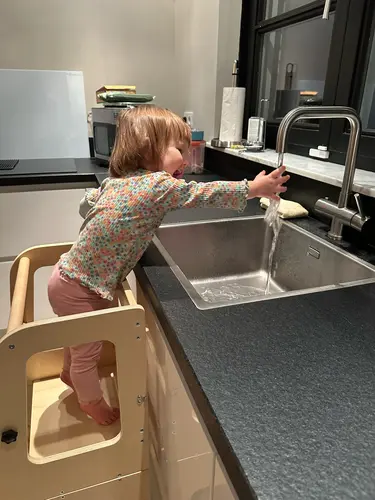 Als ze dan naar de zijkant leunen blijft dat dan goed staan? Onze leertoren ...