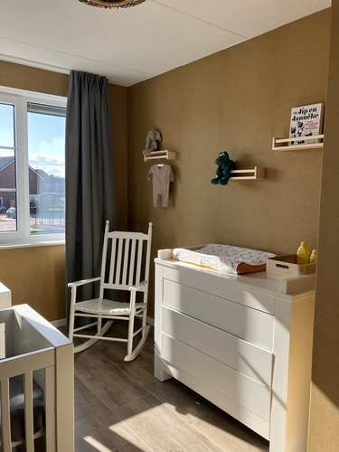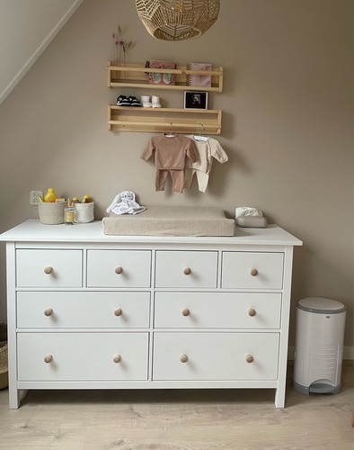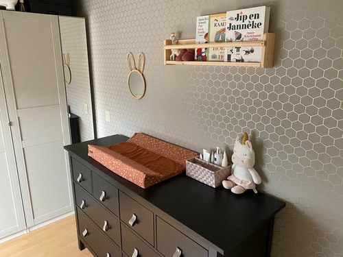 Dit inderdaad. In het begin is alles boven een commode leuk. Wij hadden hier een canvas hangen. Maar die begon ze op een gegeven moment van het haakje te trappen. Nu dus niks meer boven de commode. Nu zou een plankje ook vreselijk in de weg zitten met aankleden inderdaad!