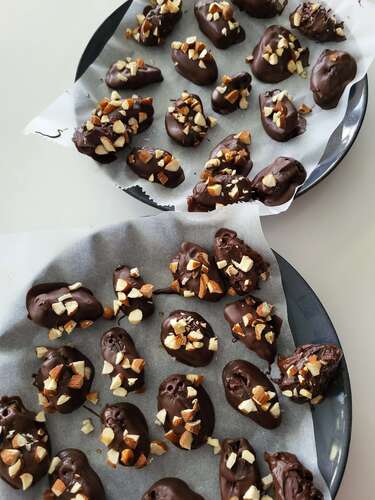 Dadels dippen in chocolade (wit) en een mengsel maken van pistache (veel recepten kan je online vinden.