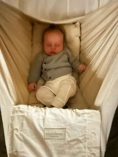 Daarnaast gebruik ik hem vaak op de vroege ochtend ook. Want meestal nachtvoeding rond 4-4.30 en dan kan hij moeilijk z’n slaap vatten. Als ik hem in de Moonboon leg maakt ie de nacht vol tot 7.00-7.30
