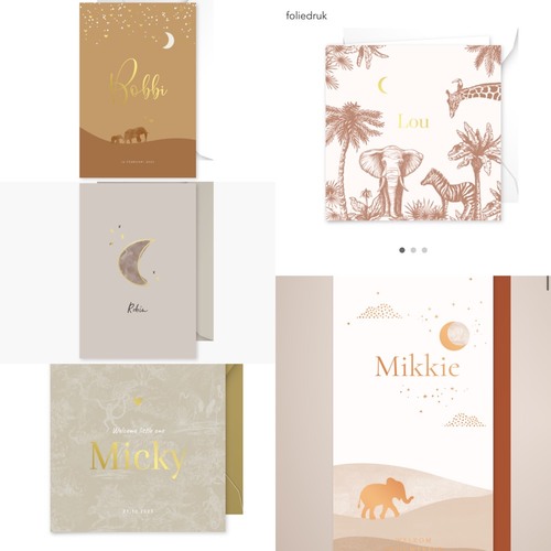 Kijk ook eens op de website van zojoann. Daar vind je ook veel kaartjes in deze stijl. Wij hebben daar de kaart van ons zoontje laten maken en gaan nu weer iets moois uitzoeken😊 Je kunt ook allerlei aanpassingen doen op het kaartje. Dus extra afbeelding toevoegen, of juist een afbeelding verwijderen, kaartje in een andere kleur, ander lettertype enz