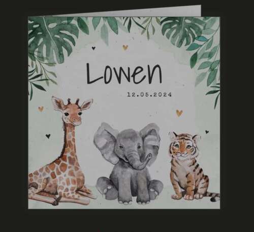 Bij onze zoon hadden we een blauwe waterverfgradiënt, ook een enkele kaart met voor en achterkant bedrukt en een klein olifantje erop. Daarom hebben we het olifantje nu weer terug laten komen.