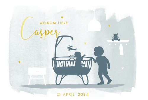 Gewoon lekker simpel, een enkele kaart, voor- en achterkant. Op de achterkant staat de volledige naam, geboortetijd, gewicht en lengte en onze gegevens. We gaan nog wel een apart kaartje voor de babyborrel erbij doen en bij de genodigden aan het kaartje vastmaken met hartvormige gouden paperclipjes.