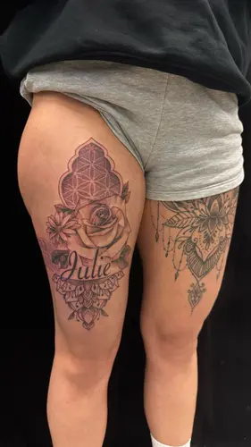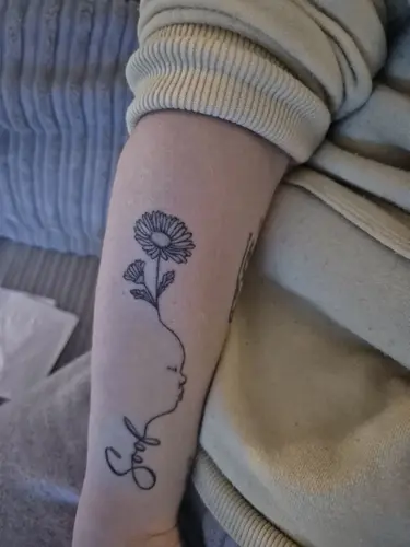 Toevallig drie weken terug de tattoo laten zetten voor m’n kleine meid. De flower of life, haar geboortebloem madeliefje en een roos voor de liefde erbij :). Ik zag het als een mooi excuus om weer een grote tattoo te laten zetten haha.