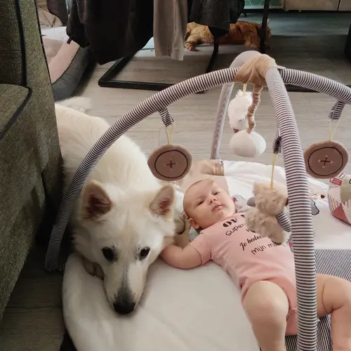 Toen ik binnen kwam lag de baby in de wagen zodat de hond mij eerst uitgebreid kan begroeten. Toen snuffelen aan de wagen. Toen ze wat rustiger was heb ik me baby eruit gehaald en in me armen aan de eettafel kon de hond aan haar voetjes snuffelen. Daarna was de lol er snel af en is ze haar ding gaan doen hahah