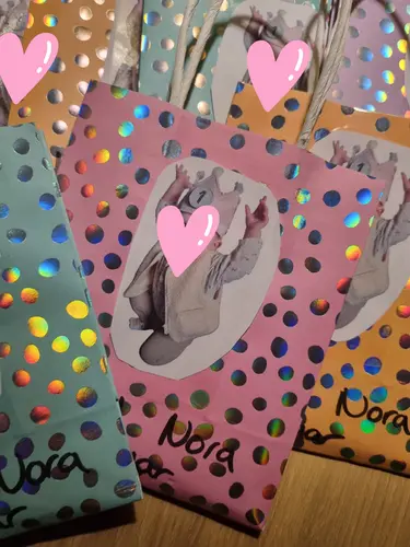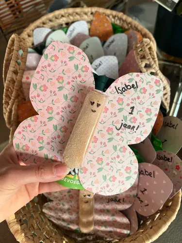Wij hebben een doosje rozijntjes met een stempeltje in een beren verpakking. Op de achterkant staat dan hoera 1 jaar! Het is wel voor een verticale groep (0-4).