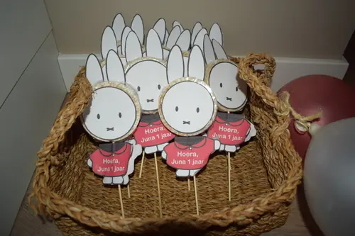Wij doen ook uitdeelboekjes (vind onze dochter zelf ook altijd erg leuk om te krijgen) van Rupsje Nooitgenoeg, met daarbij een doosje mini dadeltjes met het gezicht van Rupsje Nooitgenoeg erop. In een doorzichtig zakje, met een labeltje in de vorm van een blaadje (met 'eet' gaten erin) met "Hoera! Liya 1 jaar!" erop, en voila!