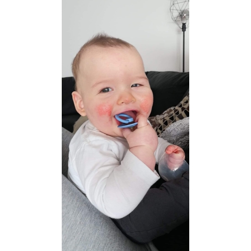 Lex is op 8-8-2019 geboren en met 4 maanden kwamen zijn eerste tanden al door. Nu is hij bijna 8 maanden en hij heeft nu 3 tanden onder en 3 boven. Zijn hoektanden boven kwamen eerder door dan zijn voortanden dus wij hebben een kleine dracula in huis. Als hij echt last heeft van zijn tanden dan helpt geen smeerseltje (dentinox) meer echt goed en dan geef ik hem een zetpil. Laatst bleef hij maar huilen midden in de nacht. Na die zetpil had hij zijn rust weer gevonden en kon hij weer lekker slapen. Dit doen we wel alleen als we het echt niet meer weten en merken dat hij pijn heeft. En hij kauwt overal op. Denk dat hij de tegendruk heel fijn vindt.
