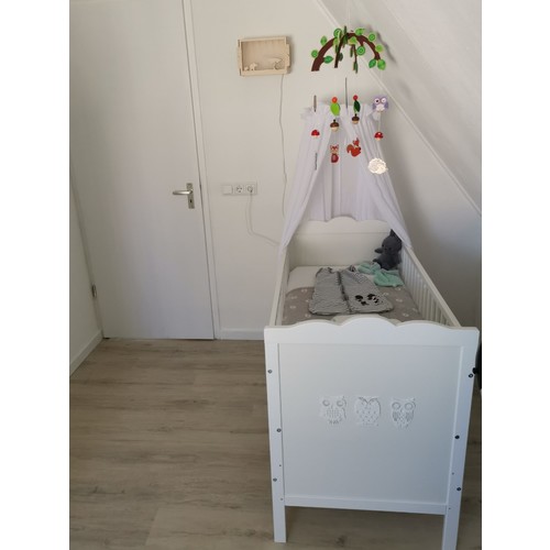 Niet te duur aangezien ze er maar even in liggen. En de voornaamste reden, de hoogte! Dit bedje past perfect aan onze boxspring. Was nogal zoeken naar een wiegje die op een hoogte van +/- 60 cm uit kwam..