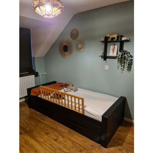 Zo is het bij ons ook. En zelfde verhaal dochter wil enkel bij mij liggen of zelfs overdwars.. En het is wel handig met de zijkant van de box. We hebben hetzelfde als jullie ongeveer. Tussen de bedrand en raam zware dozen dan staar het goed geklemd.