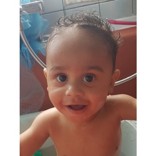 Hier een heel ander type dan jou blonde zoontje. Papa is Nigeriaans en heeft echt zwart kroezelhaar. Ons zoontje heeft bruin met beetje rosse schijn haar. Voorlopig nog steeds heel zacht en stijl. Maar als het nat is komen de mooie krullen er door. Telkens na het wassen blijven ze iets langer zitten. Het begint nu ook goed te groeien.