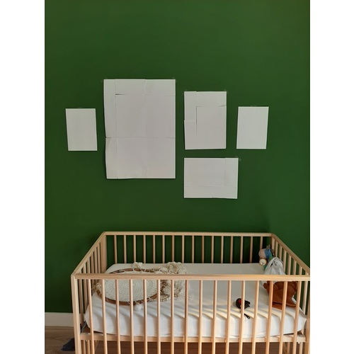 Ik ga ook een print boven het bedje hangen en bevestig het dan met van die houten latjes! Dat is niet zo zwaar als een lijst.