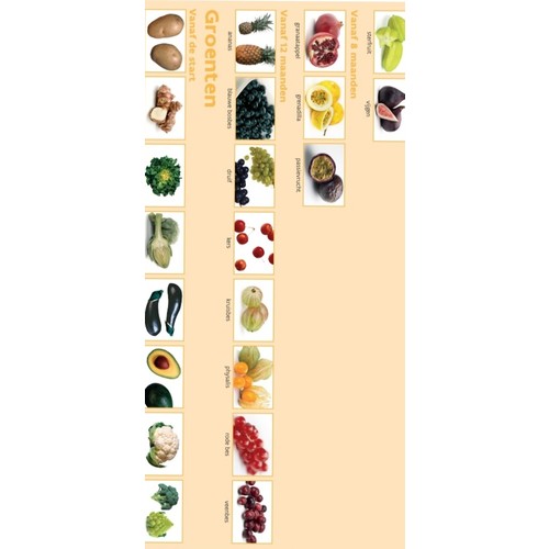 Ik weet dat je vanaf 6 maanden potjes krijgt met rood fruit. Daarvoor weet ik eerlijk gezegd niet..